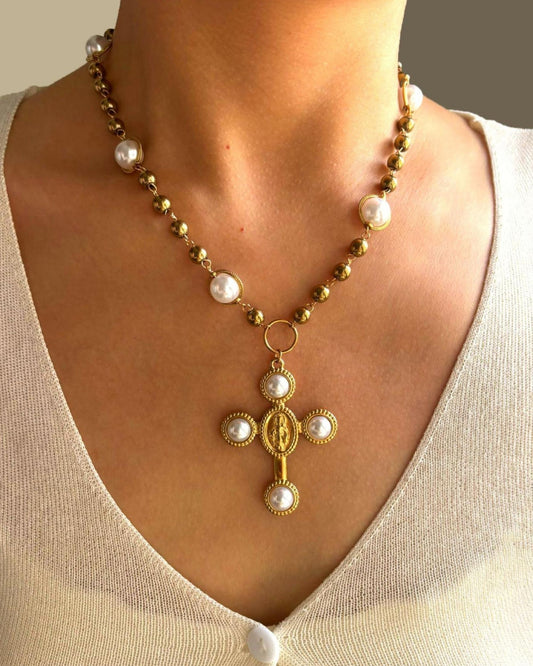 Gold Cross Pearl Bead Necklace